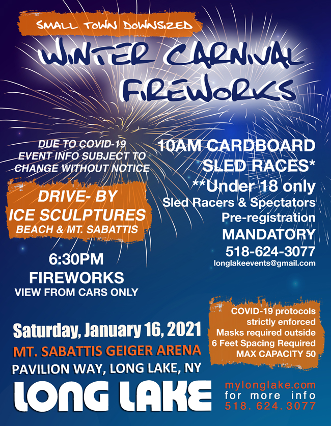 For 2018 the Ice Farm will be on site doing ice carving demonstrations throughout the day and the day concludes with a fireworks display at 6:30pm. The Long Lake Little Bus (our answer to Uber) is free and available starting at 5pm. Call 518.323-5001.