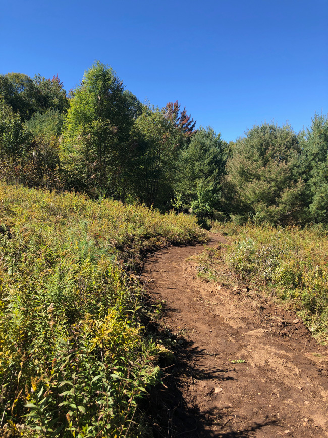 “Black and Blue” is the intermediate more difficult loop at 1.2km / .74 miles in length. This loop starts off to the at the Mt. Sabattis Pavilion parking lot and climbs behind the open area featuring a bluebird house. Riders than swoop down and can choose to navigate the lower section or hop right onto the climbing trail through the woods. Once you climb several winding S curves and cross the gravel roadway, riders are delivered to the meadow and ready to rip along 6 S curves winding back and forth and traversing the open area of Sabattis.