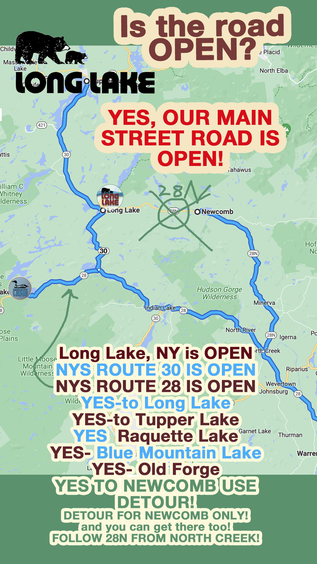 Road crews working non-stop to get us re-connected to Newcomb! But for now.. we are happy to go to the Transfer Station from 7pm – 9pm and also to get our Long Lake East residents OUT and about!