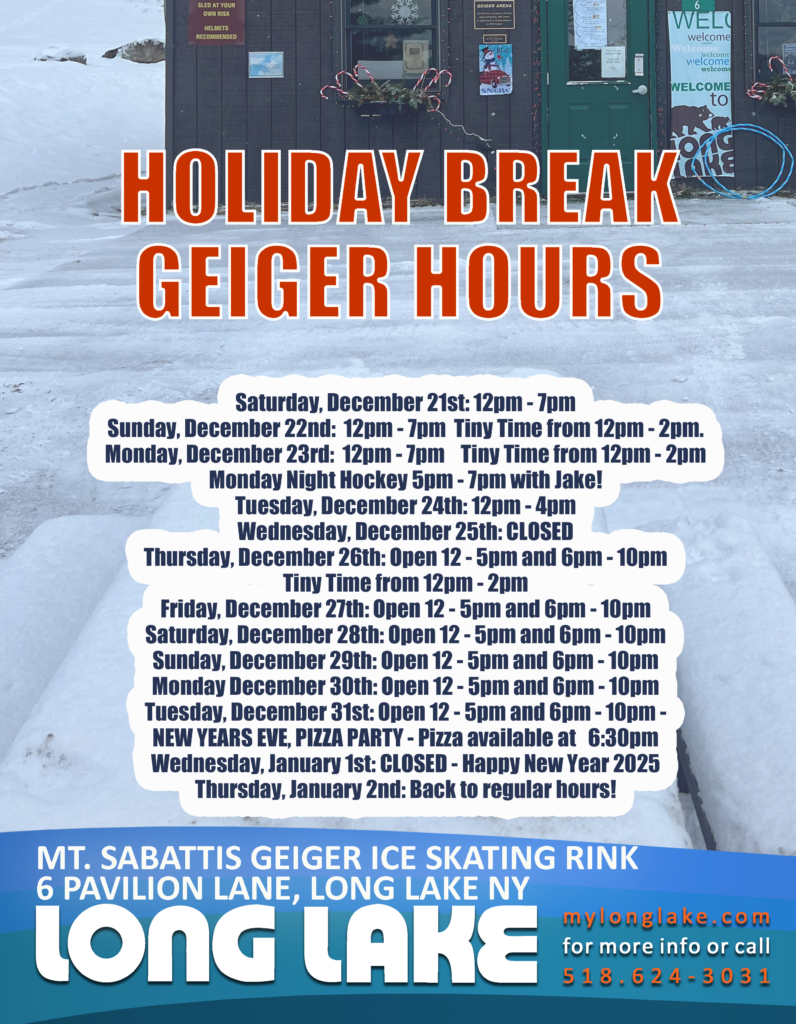 The Geiger Ice Skating Arena and Mt. Sabattis Sledding Hill Hours.