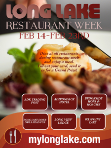 Sample the best of the region’s culinary offerings during Restaurant Week! Participating locations include The Long View Lodge, ADK Trading Post, Adirondack Hotel, Brookside Hops & Hoagies, Long Lake Diner, and Waypoint Cafe. Enjoy special menus, creative dishes, and discounts all week long.