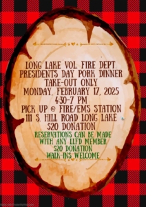 Support the Long Lake Volunteer Fire Department while enjoying a delicious to-go only pork dinner. This community favorite is not to be missed. Call 518-624-4599 to reserve yours.