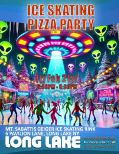 Geiger Arena/Mt Sabattis Recreation Area. Close out Winter Wonderland Week with a pizza party sponsored by the Town of Long Lake Parks & Recreation Department at the Geiger Arena from 6:00pm-8:30pm. Enjoy free skating and sledding under the stars, with a bonfire in our custom Long Lake fire pit, and pizza, aliens, astronaut favorite, “Tang” and hot cocoa to warm you up.