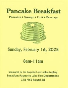 Wrap up your weekend with a hearty pancake breakfast served by the Raquette Lake Ladies Auxiliary.