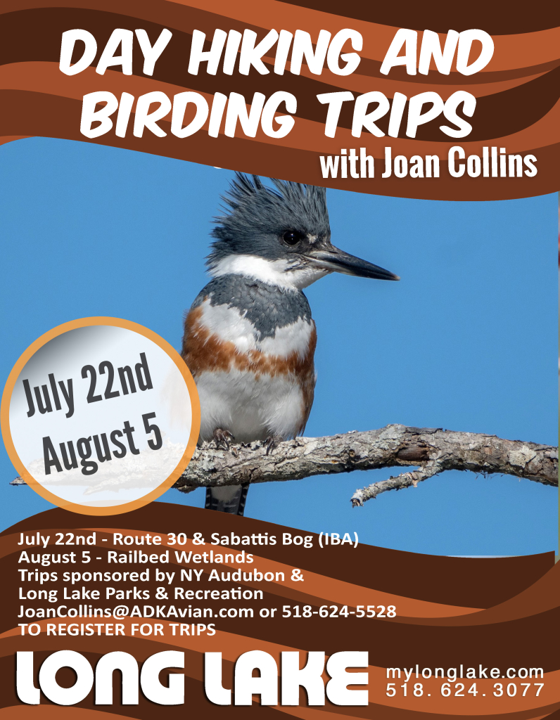 Joan Collins is Long Lake’s own resident Birding Expert. Joan leads hikes throughout the year partnering with Long Lake Parks and Recreation and the Northern New York Audubon Society. Joan’s knowledge and skill is beyond measure. She plots out excellent trips to garner sights and sounds of a variety of birds that never disappoints. Joan will be leading a hike on Tuesday, August 5th along the Roosevelt Truck Trail. Max 13 participants. To register, contact Joan atJoanCollins@ADKAvian.com or 518-624-5528. This field trip is jointly sponsored by Northern New York Audubon and the Long Lake Parks and Recreation Department. There is a maximum of 13 participants