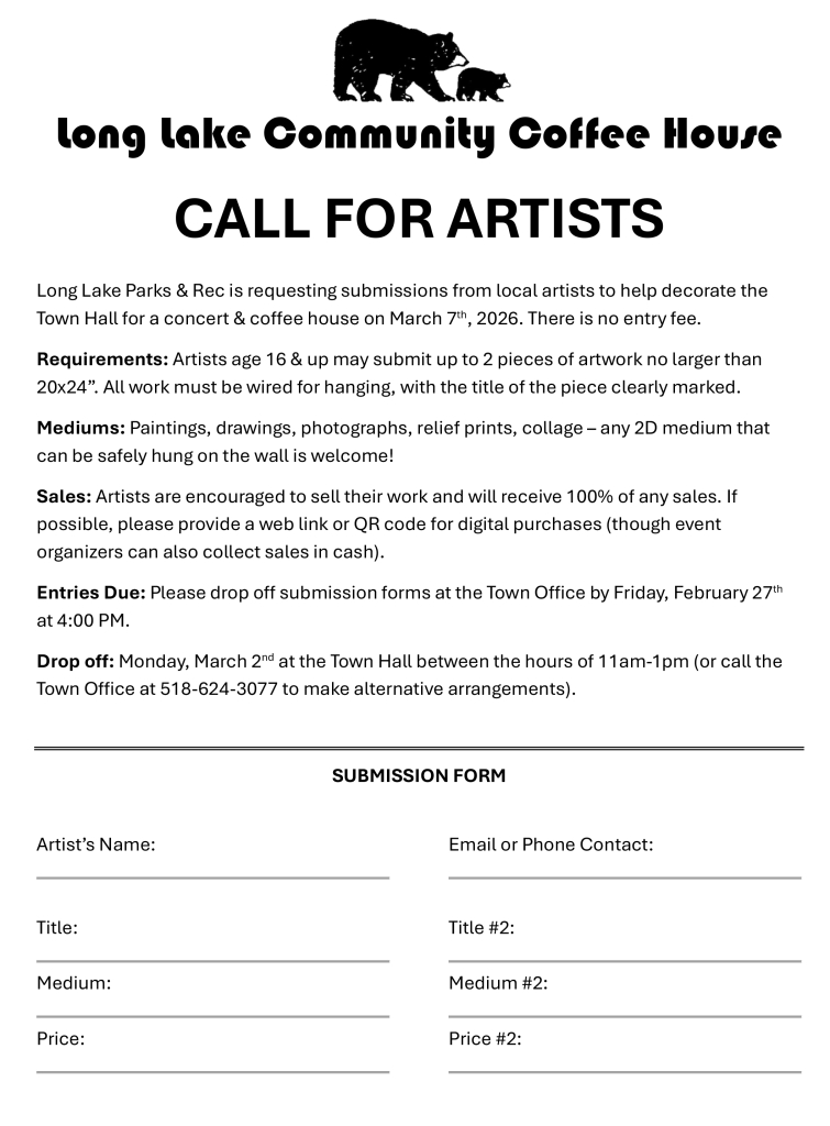 Submission forms must be dropped off at the Town Office by Friday, February 27, 2026 at 4:00 PM. Artwork drop-off will take place on Monday, March 2, 2026 at the Long Lake Town Hall between 11:00 AM and 1:00 PM. Artists needing alternative arrangements may contact the Town Office at 518-624-3077.