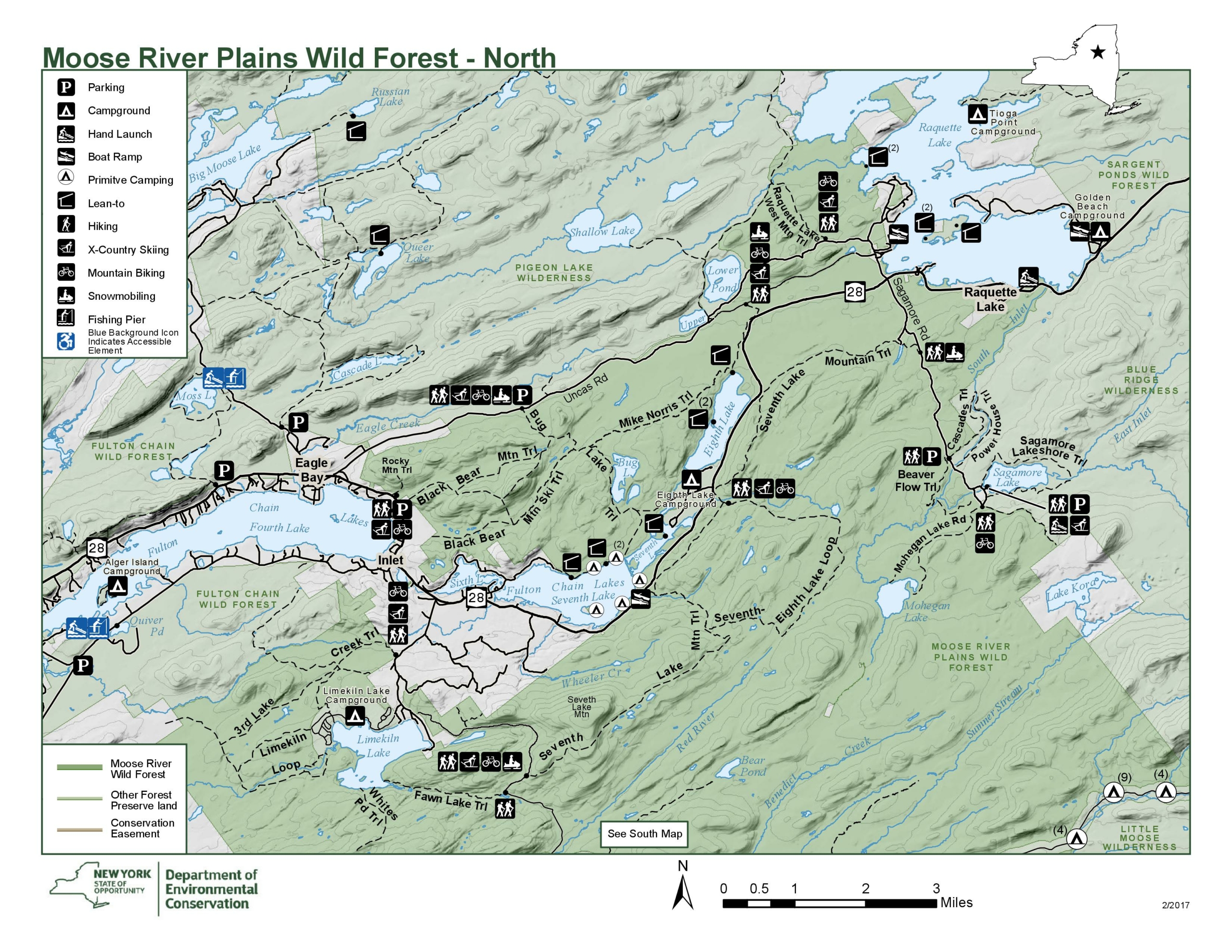 A multi-use trail open year round. This trail connects Sagamore Road to the Limekiln Lake-Cedar River Road and the Sagamore Road. It connects with the Old Uncas Road Trail near each of the State Route 28 trailheads. For hiking best access is at the 7th Lake boat launch on route 28 – trail head across the road. Head towards Raquette Lake and Old Uncas Road.