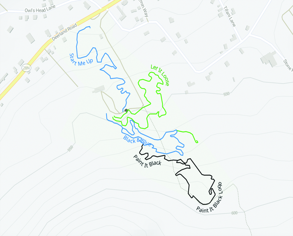 PAINT IT BLACK (1.25km) An expert, machine-built trail with two distinct sections. The first section is a TWO-WAY trail branching off Black & Blue climbing up Mt Sabattis as it winds through the woods, eventually crossing the field and entering the woods on the eastern side of the property before eventually merging with the Powerline/Northville-Placid Spur Trail. The second section starts as you emerge from the NPT Spur Trail and becomes a directional ONE-WAY downhill trail with a machine-built jump line featuring tabletops, step-ups, and a rock drop. All the features are rollable, but do not have any ride arounds.