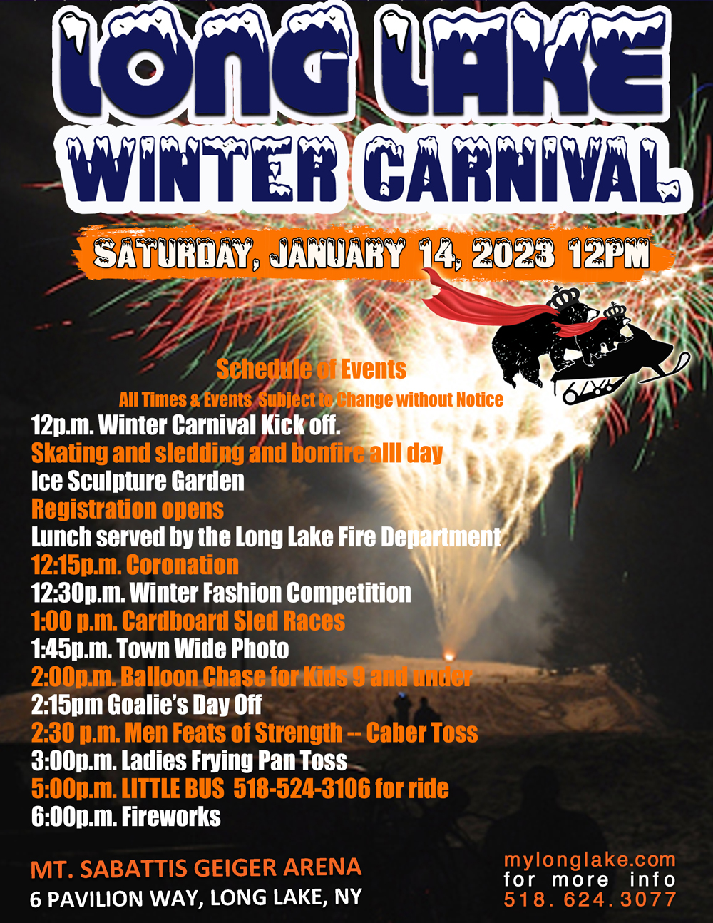 On Saturday, January 17th at noon the Long Lake Winter Carnival will be held at Mt. Sabattis Recreation Center in Long Lake, NY.
