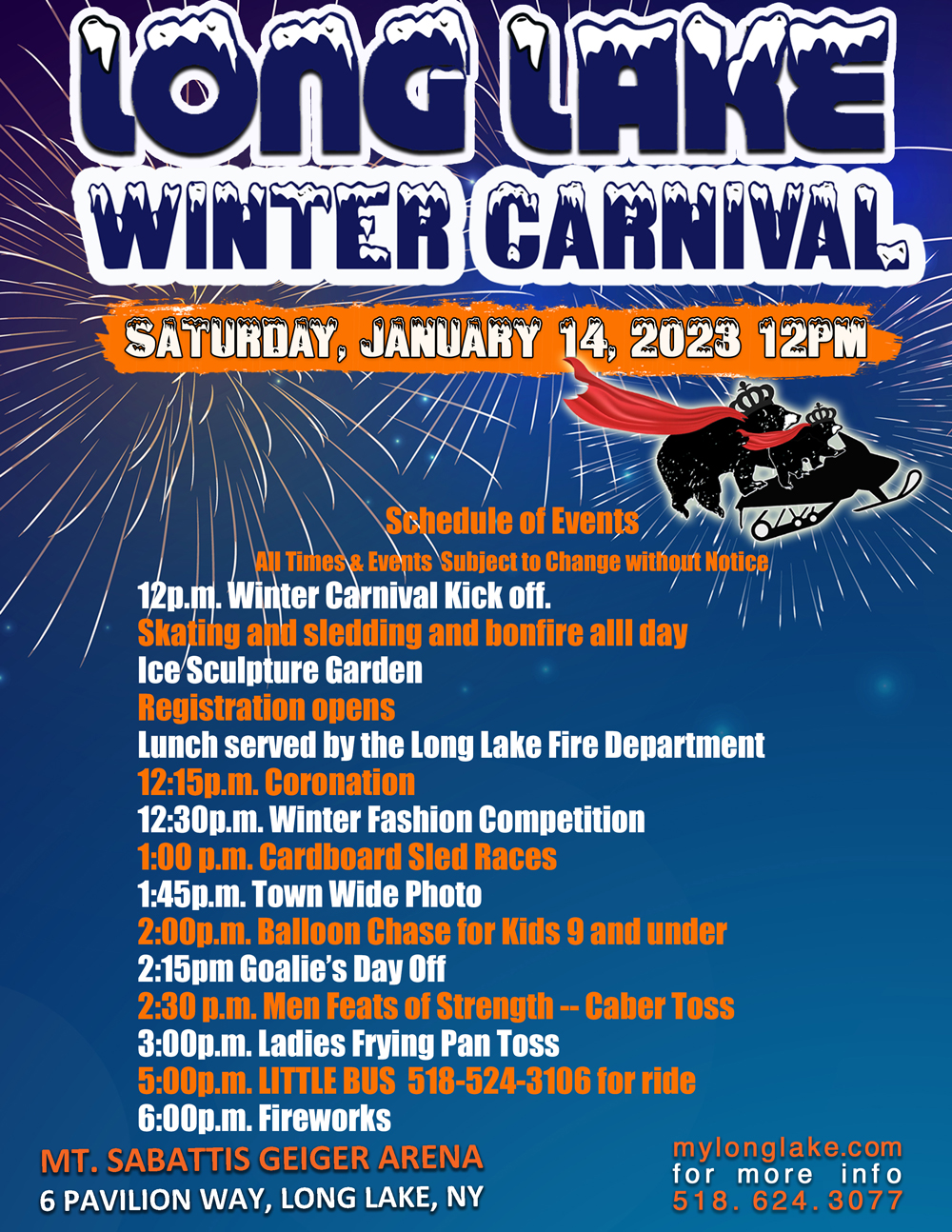 Enjoy a full day of winter fun and games for all ages at Mt. Sabattis! Watch a live ice-carving demonstration by The Ice Farm, cheer on the Cardboard Sled Races, and take part in classic events including the Ladies Frying Pan Toss, Men’s Keg Toss, and the return of Broomball! The Coronation of Winter Carnival Royalty and a grand Fireworks Display cap off the day.